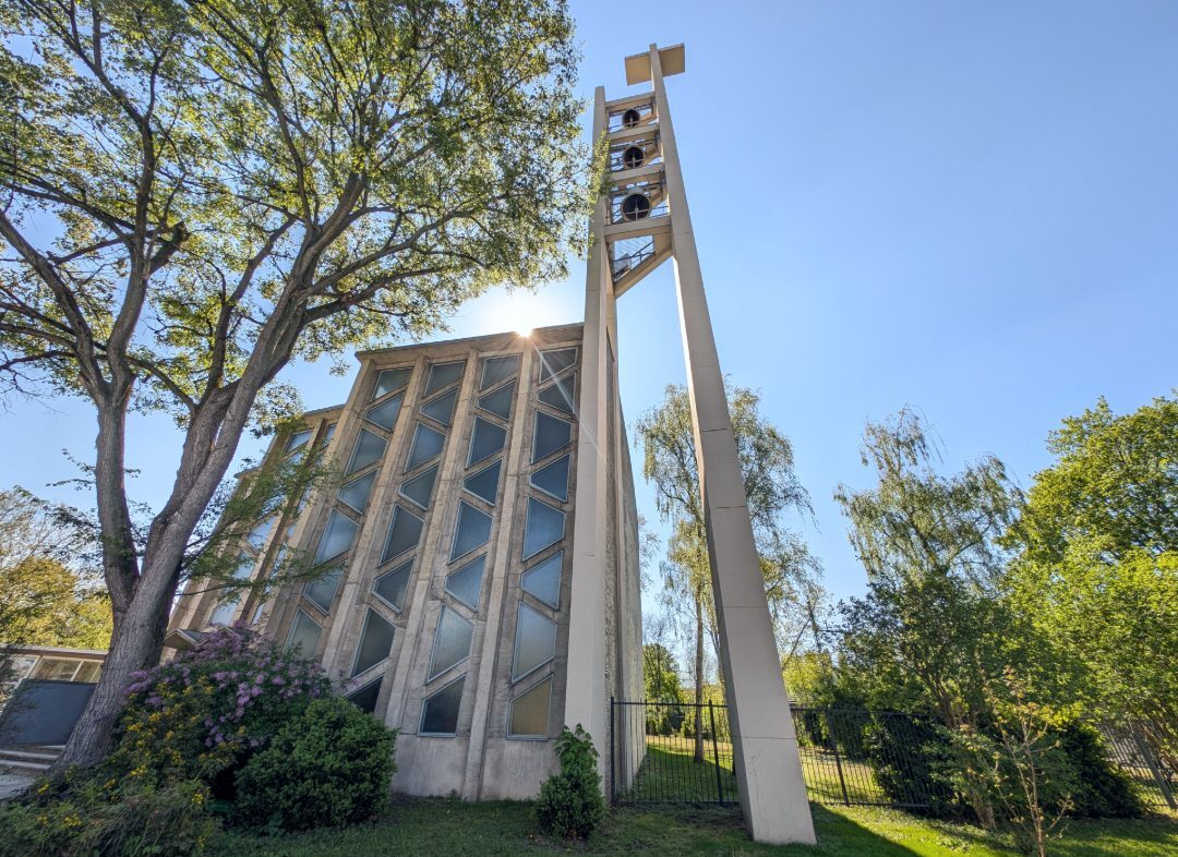 Was für ein Gebäude! Einem gestrandeten UFO gleich steht der parabelförmige Sakralbau mit seinem über 40 Meter hohen, dreieckigen Kirchturm in einem ruhigen Tempelhofer Wohnviertel. Eine begehbare Skulptur aus Beton und Glas.