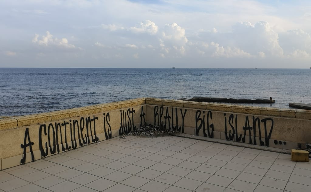 Vor uns der Pool, „Infinity Pool“ würde man heute dazu sagen, dahinter das azurblaue Meer. Der Pool ist leer, vermüllt, geziert von weiterer Street Art. Im wuchernden Gebüsch dahinter könnten Kinder Versteck spielen.