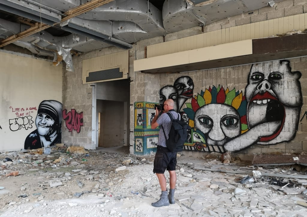 Wir laufen dem Lachen hinterher, hinaus auf die ehemalige Terrasse. Wir sind nicht die einzigen Besucher! Oben auf dem Flachdach kichern junge Mädchen mit wehendem Haar, die Handys fürs Selfie gezückt. Ihre Begleiter sind unten geblieben, trinken Dosenbier auf einer Treppe, deren Geländer abbrach. Und noch weiter unten stakst eine Urlauberfamilie über den Schutt.