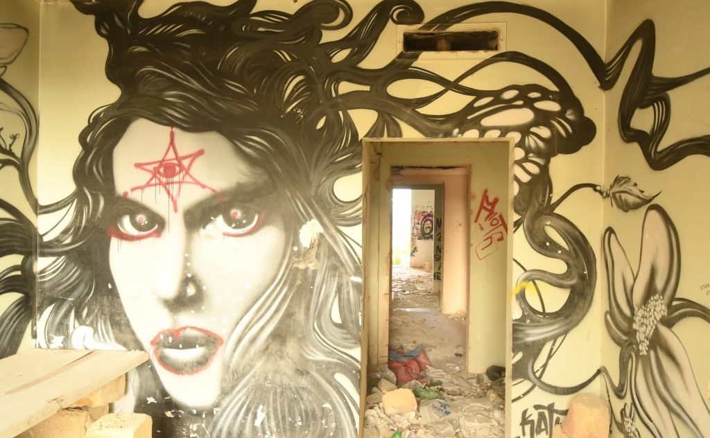 Staunen vor allem deswegen, weil sich auch im Inneren der Streetart-Reigen fortsetzt. Arbeiten von großer Raffinesse zeigen sich uns an den verlotterten Wänden, aber auch viel Geschmiere und Graffiti von drittklassiger Qualität. Langwimprige Frauengesichter schauen uns an, Mutter Theresa lacht aus einem Eck hervor.
