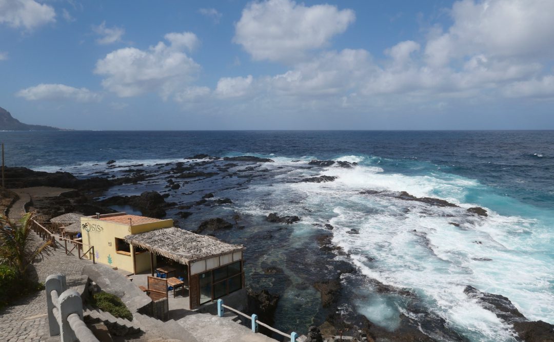 Das letzte Stück der Strecke führt über einen schwarzen Lavastrand in die Siedlung Tarrafal. Sie liegt am Fuße steil aufsteigender, karger Berge. Davor das Meer. Weiter draußen ist es in Rage. Die vorherrschenden Nordostwinde peitschen die See auf und lassen sie kräuseln, vor allem jetzt in der Tempo das Brisas, der „Zeit der Winde“. In Tarrafal spürt man den Wind nicht. Die Berge geben Schutz, es ist tropisch warm.